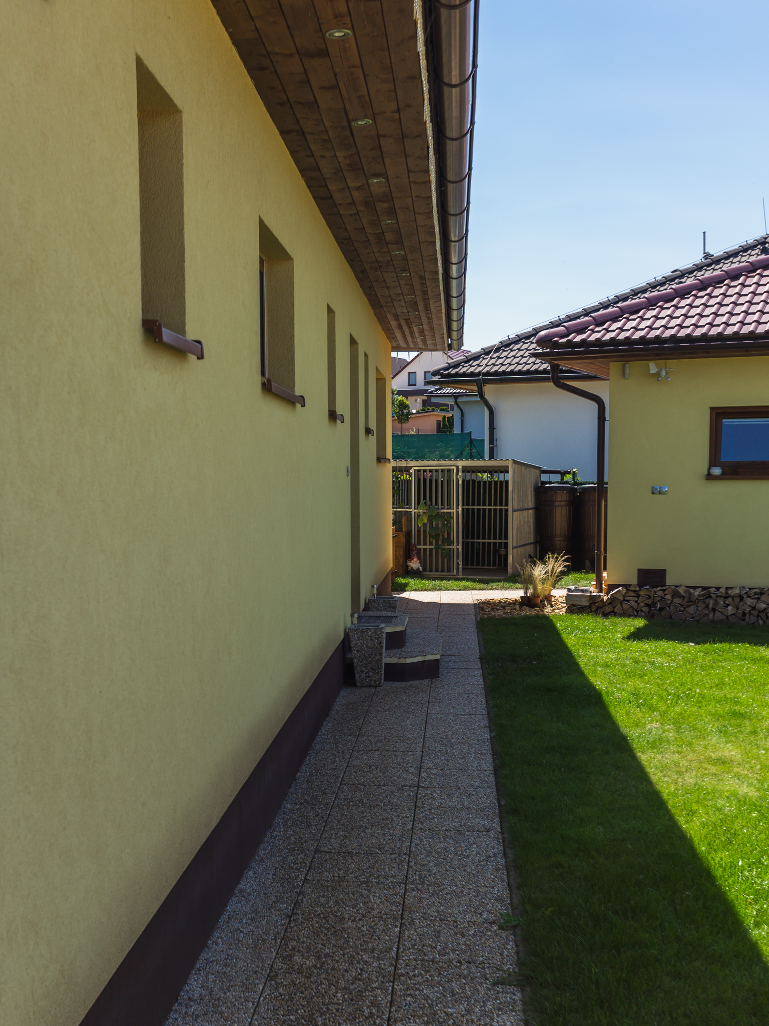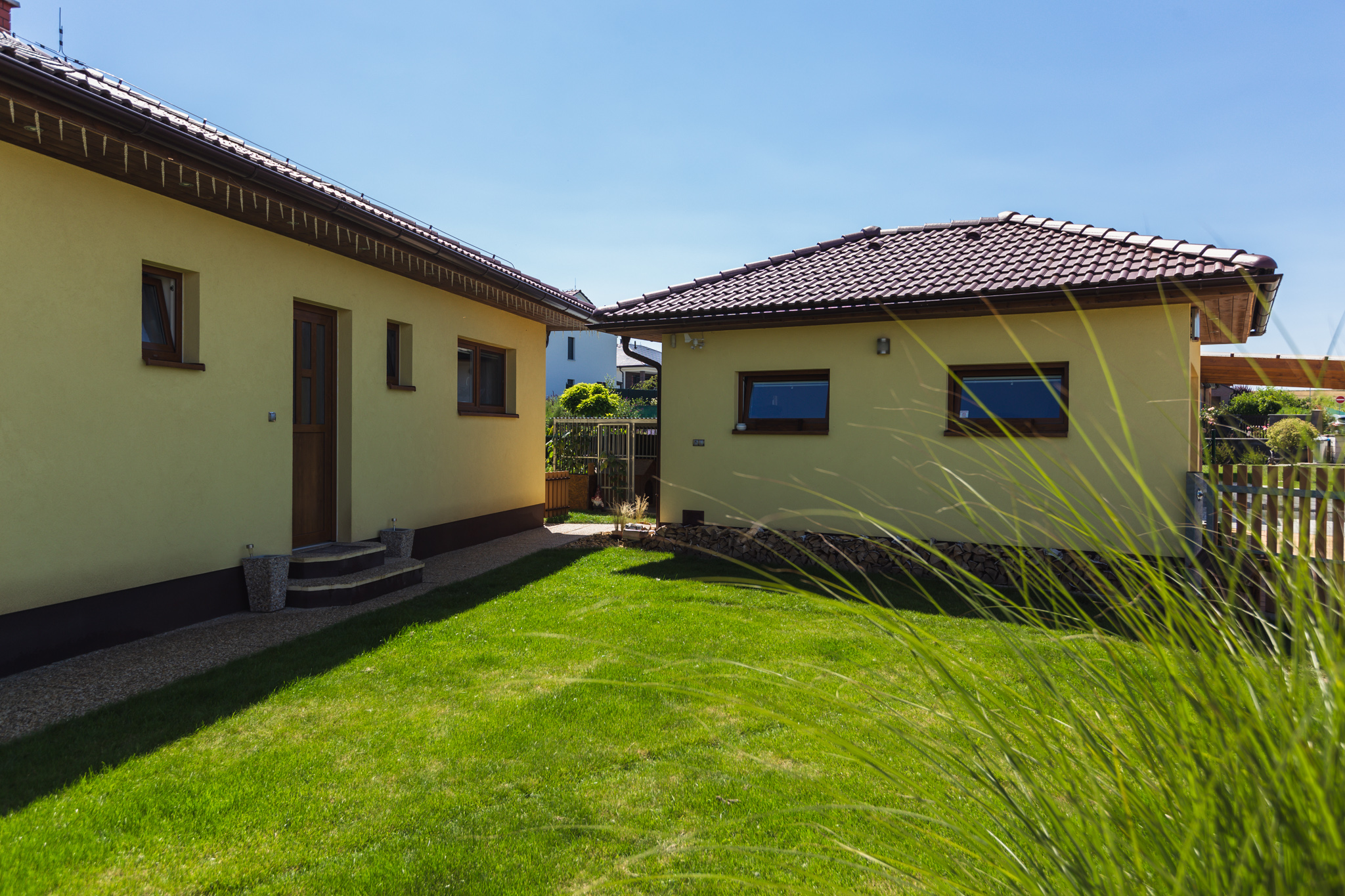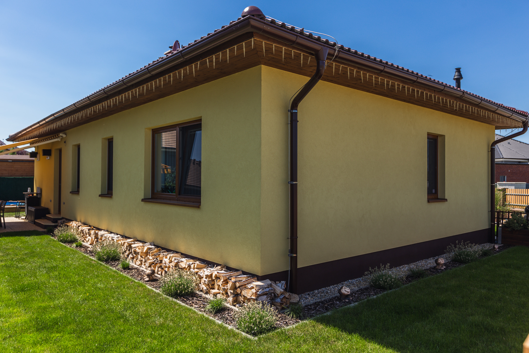 Na tuto stavbu jsme dodávali veškerý stavební materiál - kari sítě, bednící dílce, cihly, překlady, komín, střešní krytina, veškerý materiál na sádrokartonový strop, omítky, štuky, interiérová barva, fasádní silikonová omítka, dekorativní omítka, venkovní dlažby a plot.